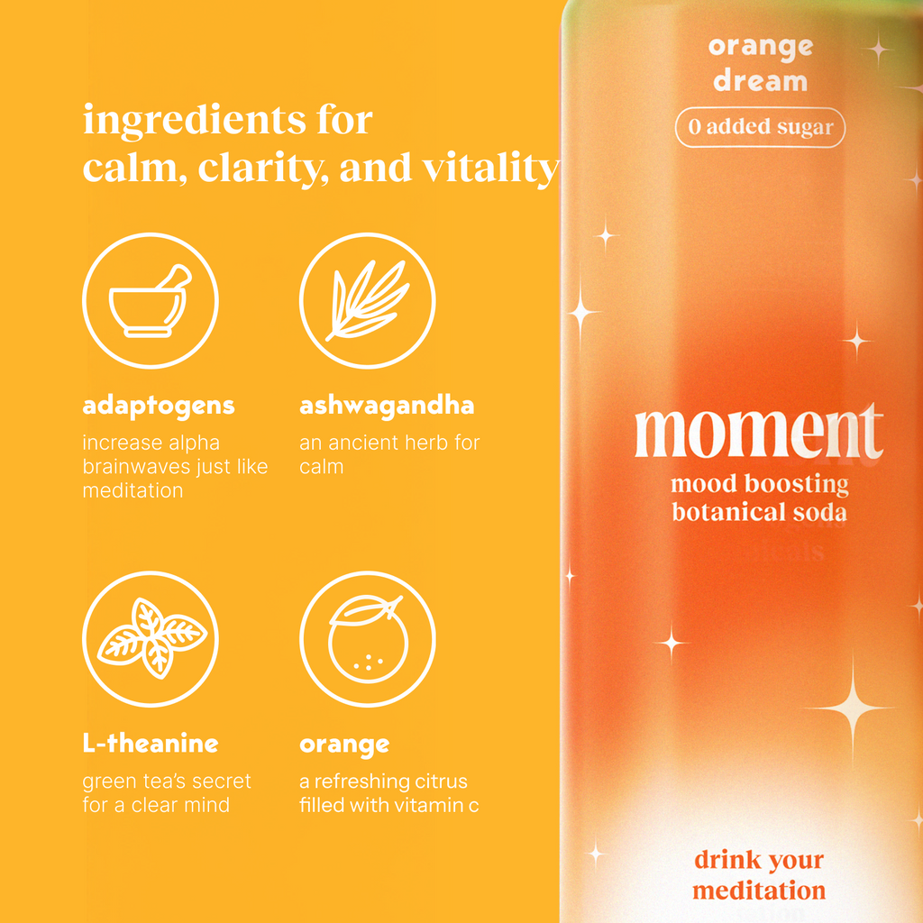 Orange dream blends bright citrus with dreamy calm. It’s the fizzy, feel-good soda you crave, but with zero added sugar and calming, mood-boosting botanicals. It's sparkling, feel-good, and totally crash-free.